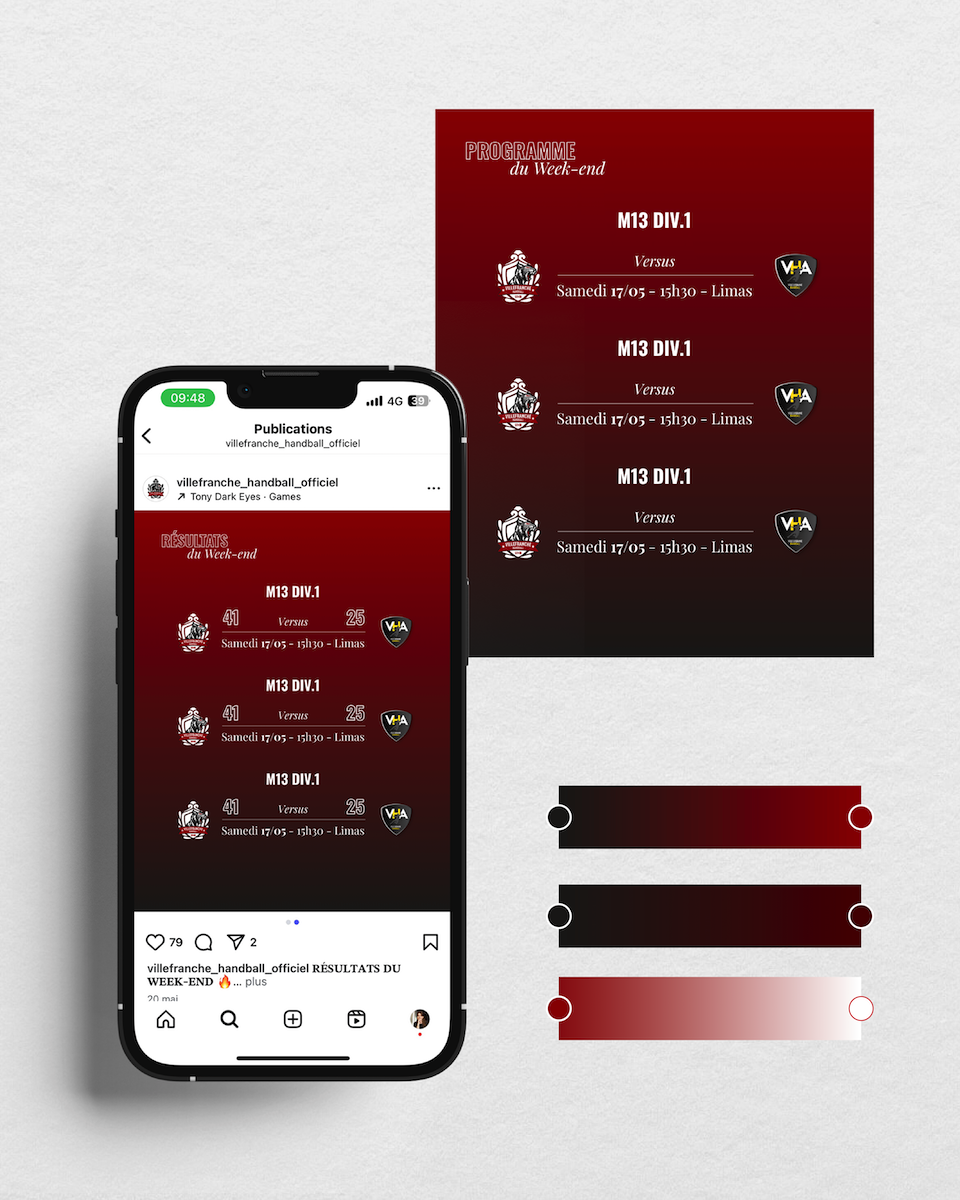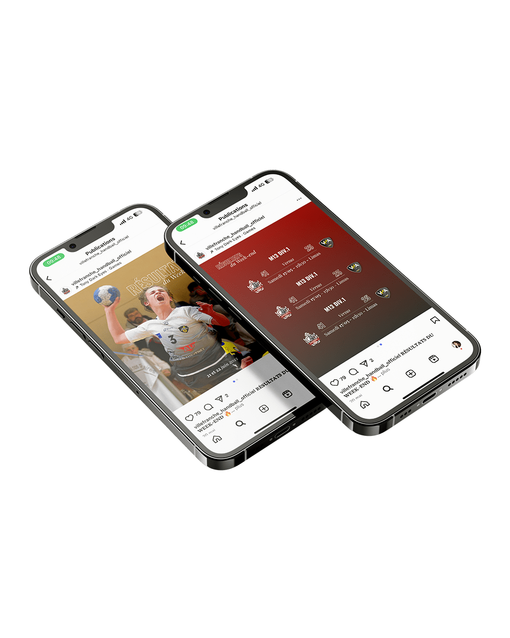 Accompagnement dans la professionnalisation de l’identité visuelle du Villefranche Handball Beaujolais à partir de l’existant et création de templates personnalisables.